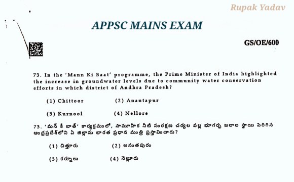 73. In the ‘Mann Ki Baat programme, the Prime Minister of India highlighted the increase in groundwater levels due to community water conservation efforts in which district of Andhra Pradesh? (1) Chittoor(2) Anantapur(3) Kurnool(4) Nellore